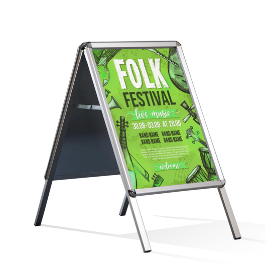 Kundenstopper mit Aluminium-Profil (Klapprahmen) in unterschiedlichen Formaten. Der Plakatständer hat die Farbe Silber Eloxal, ist mit 0,7 mm Antireflex-Schutzfolie ausgestattet und überzeugt mit abgerundeten Chrom-Ecken (Rondo). Die massive und voll verzinkte Rückwand verleiht diesem Qualitätsprodukt extra Gewicht und erhöht die Standfestigkeit am Point of Sale.